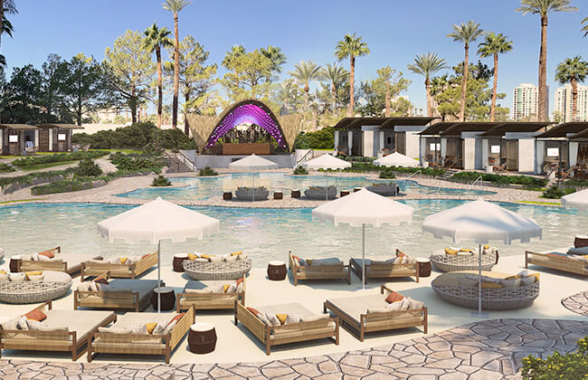 Élia Beach will debut at the Virgin Hotel Las Vegas this June 2021. This newest beach club will overlook the Mediterranean-colored pool, and the musical style of DJs and notable guest performers will incorporate tropical house, world house and deep house, with a mindset of escape, dancing and just good vibes. The beautifully designed stage complete with a straw thatched roof creates a desirable and attractive focal point to the venue that will not only lure in guests and performers but will create a cohesive desire to be a part of the experience it exudes.